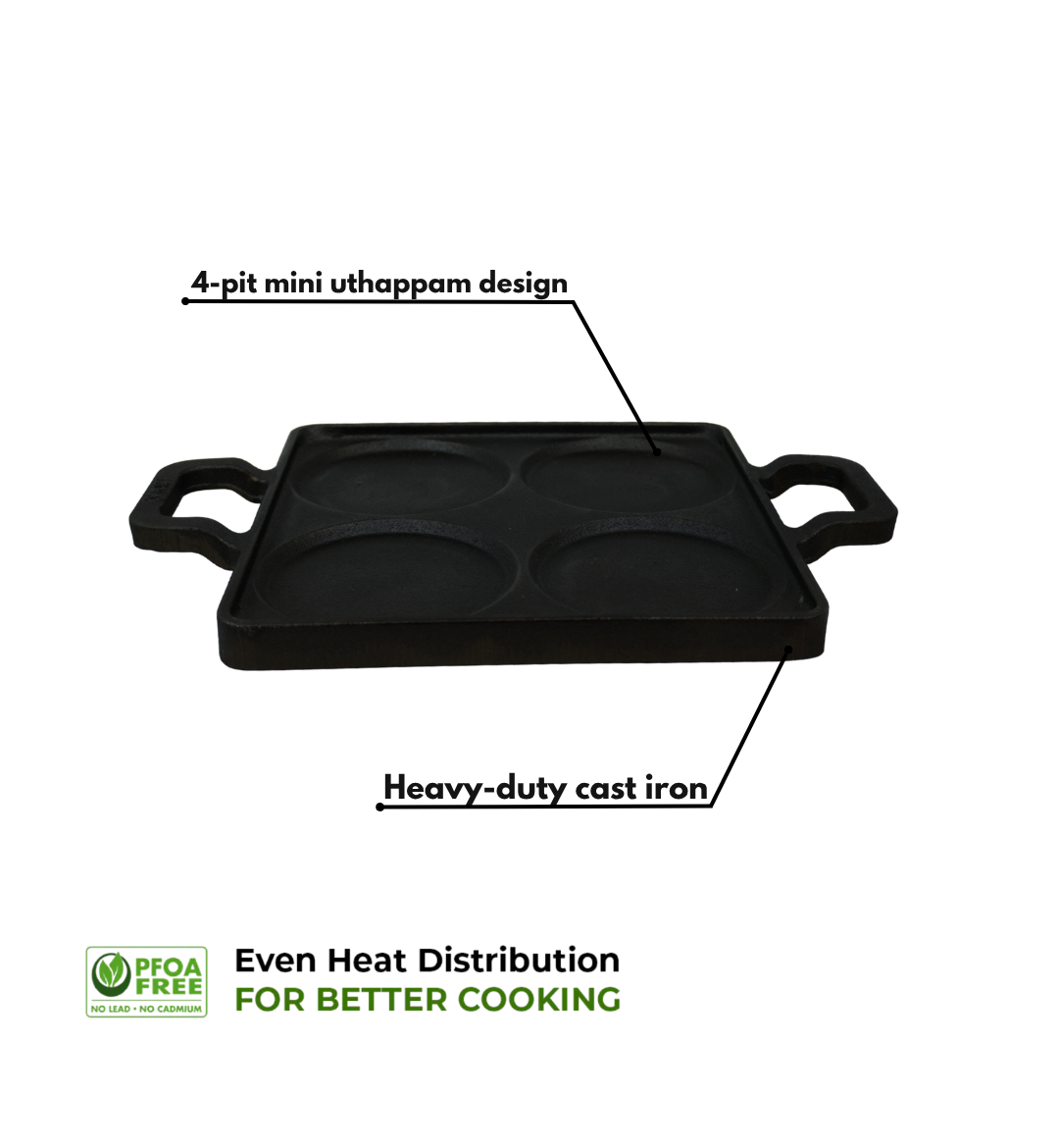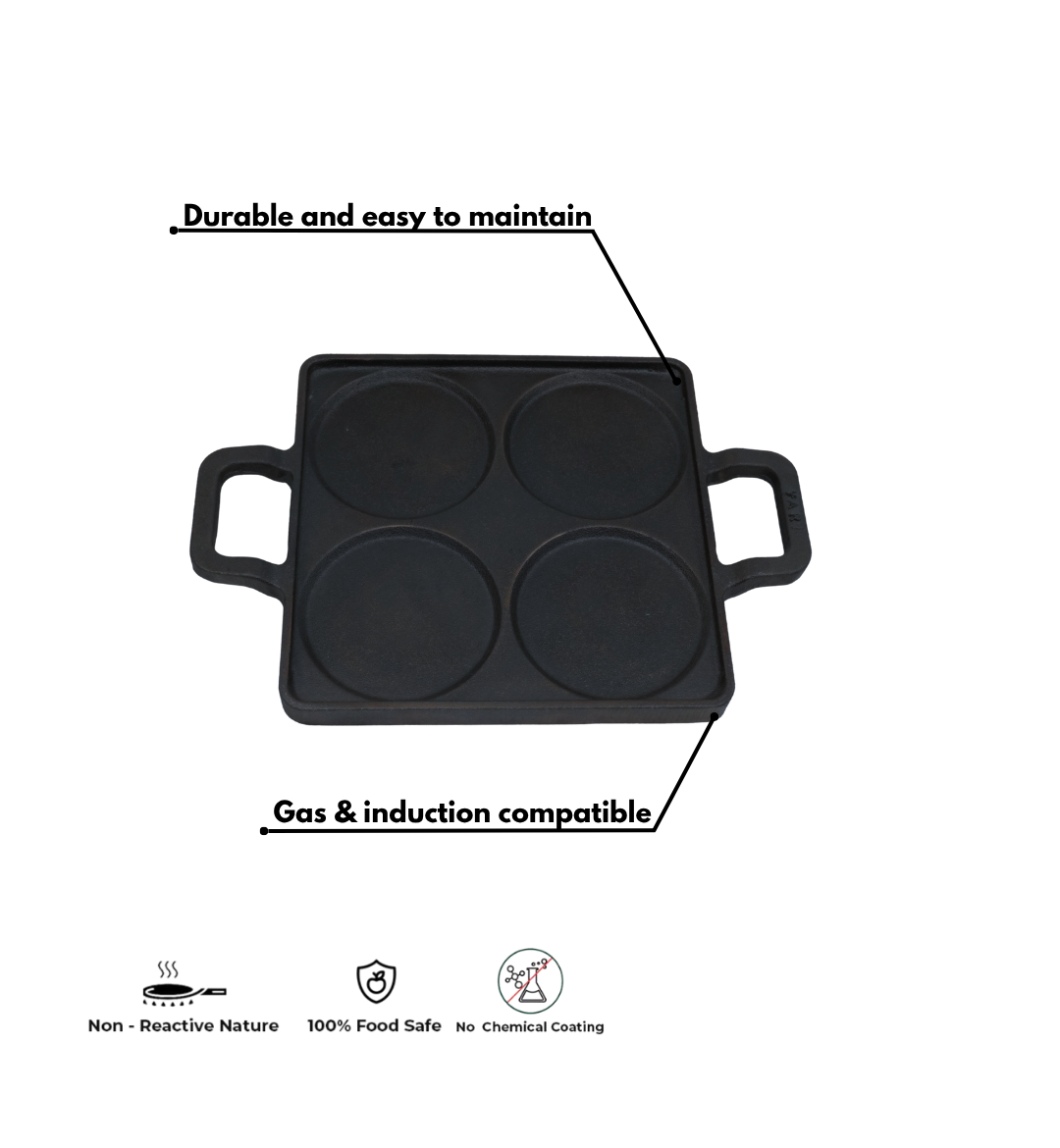 Cook multiple uthappams at once with our square cast iron uthappam kal. Its wide surface, superior heat retention, and even cooking make it perfect for serving crispy, flavorful uthappams every time. Strong, traditional, and long-lasting.}