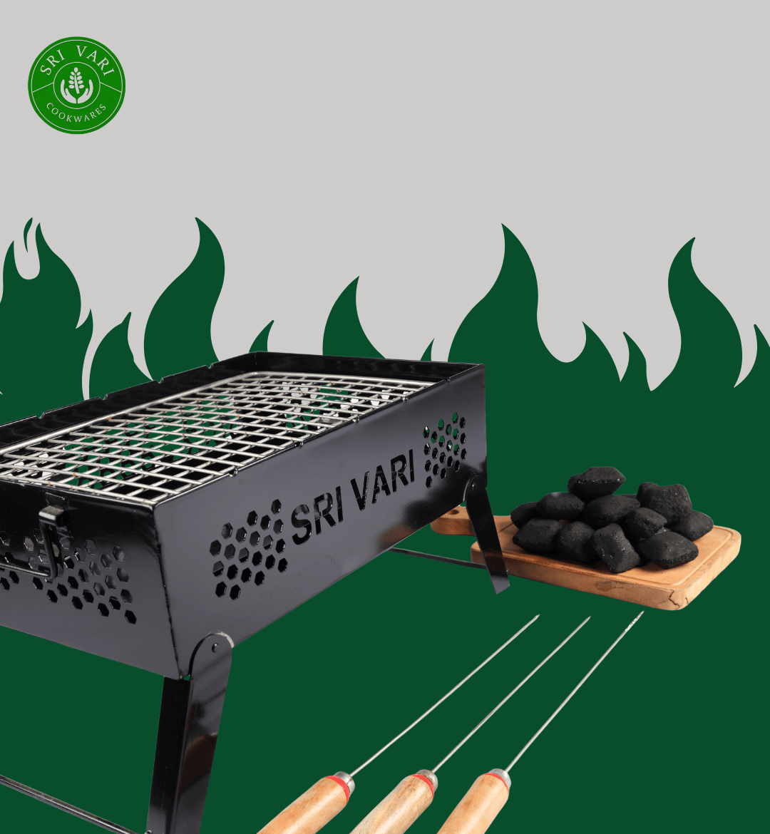 Experience authentic smoky flavour with the Sri Vari Charcoal Barbecue Grill, designed for powerful performance and durability. Built with a sturdy steel body and a high-strength grilling mesh, this grill delivers even heat distribution for perfectly cooked kebabs, vegetables, paneer, and meats every time. The grill features multiple wooden handles on skewers for easy rotation and safe handling while cooking.
