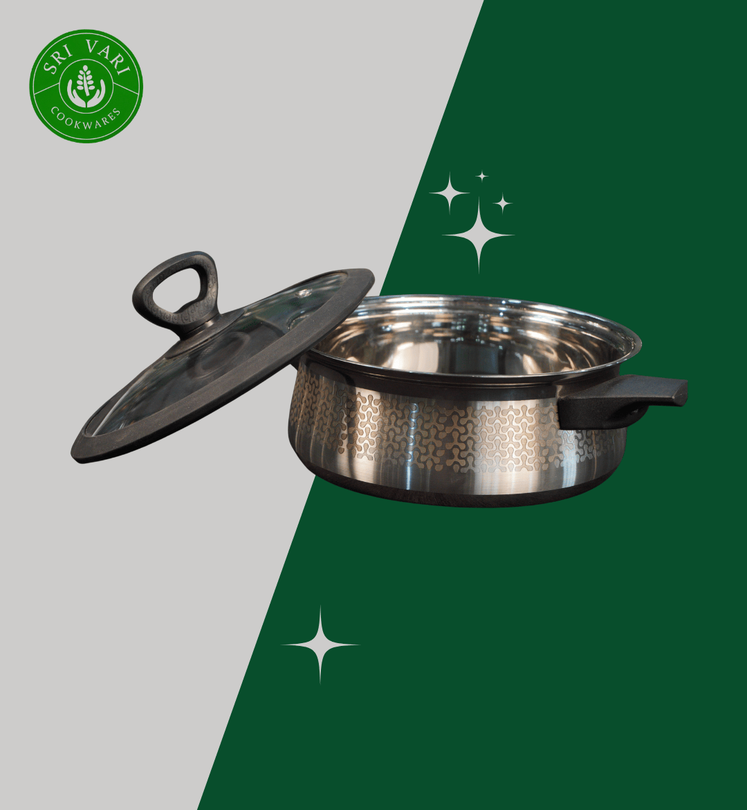 Cook your favorite gravies, curries, and everyday dishes with the Sri Vari Steel Gravy Pot. Made from high-quality stainless steel, this pot is designed for durability, strength, and long-lasting performance. The sturdy steel handles and well-fitted lid make cooking and handling easy while maintaining the heat for perfectly cooked meals.