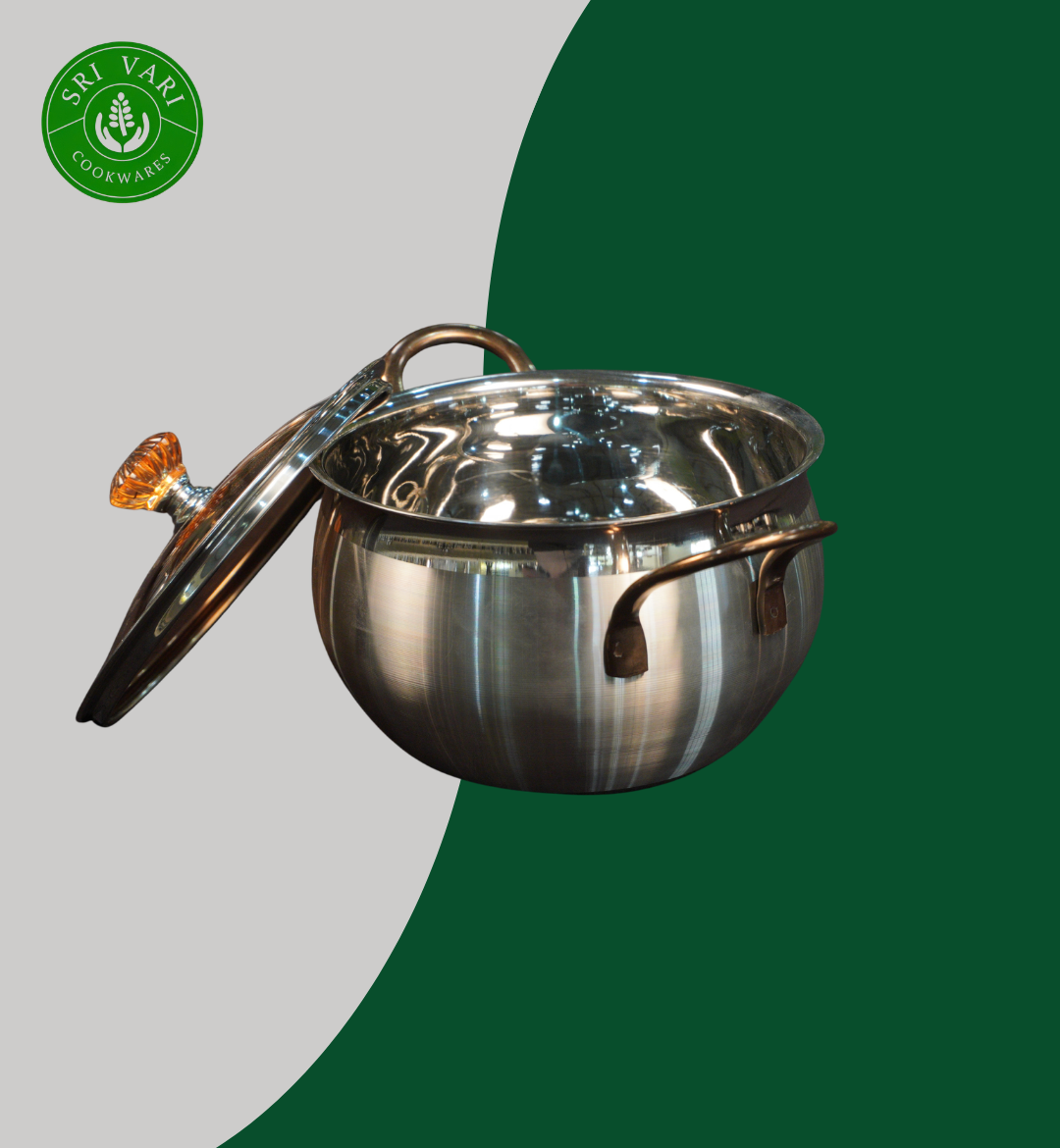 Cook delicious biryani, gravies, and family meals with the Sri Vari Stainless Steel Biryani Pot. Crafted from high-quality stainless steel, this pot offers excellent durability, a polished mirror finish, and strong side handles for easy handling. Its wide design allows even cooking, making it perfect for preparing flavorful biryani, curries, and large meals with ease.