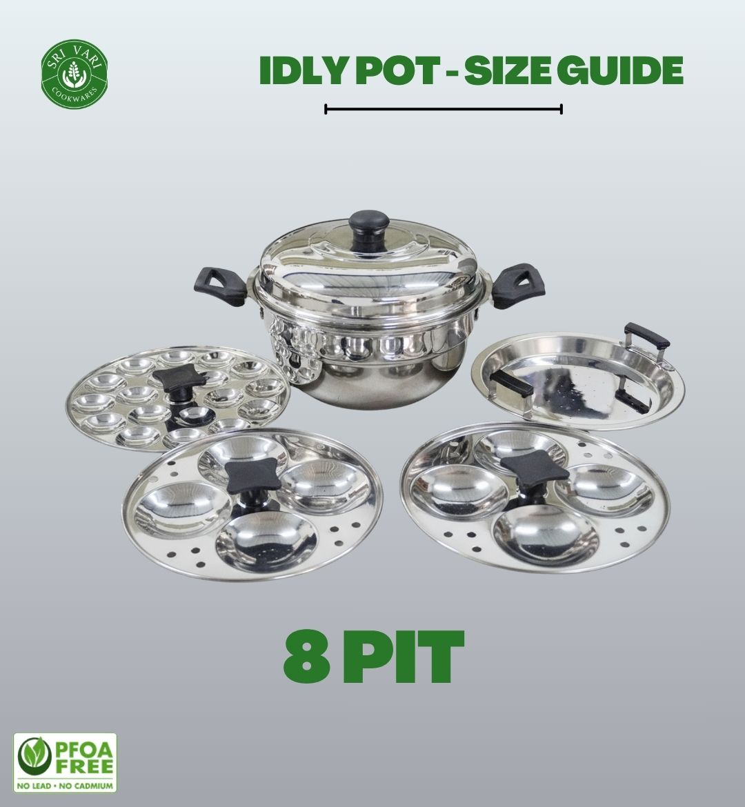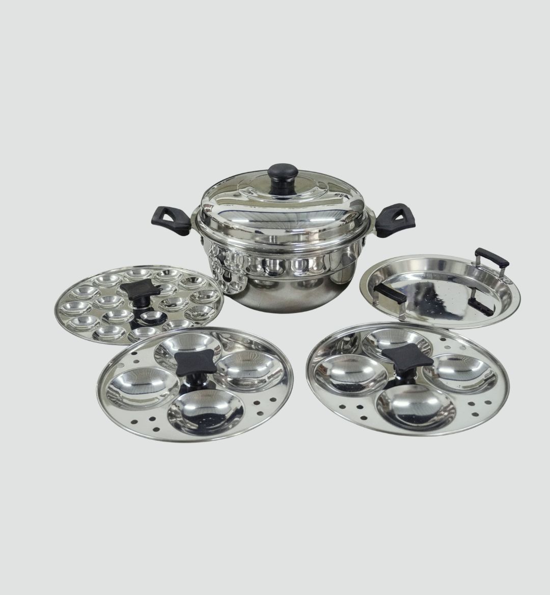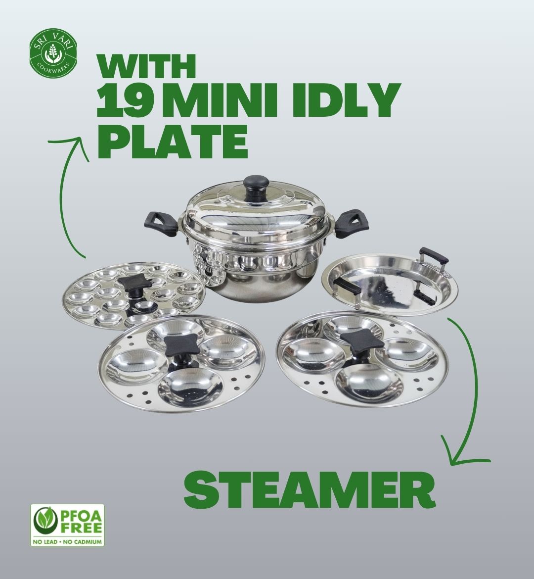 Crafted with premium stainless steel, Sri Vari’s Idly Pot ensures even steam distribution for soft, perfectly cooked idlis every time. Its sturdy handles provide a firm grip, while the thick base ensures durability and faster heating. Ideal for home and commercial use, this idly pot comes with multi-plate options to make more idlis in one go. Easy to clean, rust-resistant, and designed for long-lasting performance.}